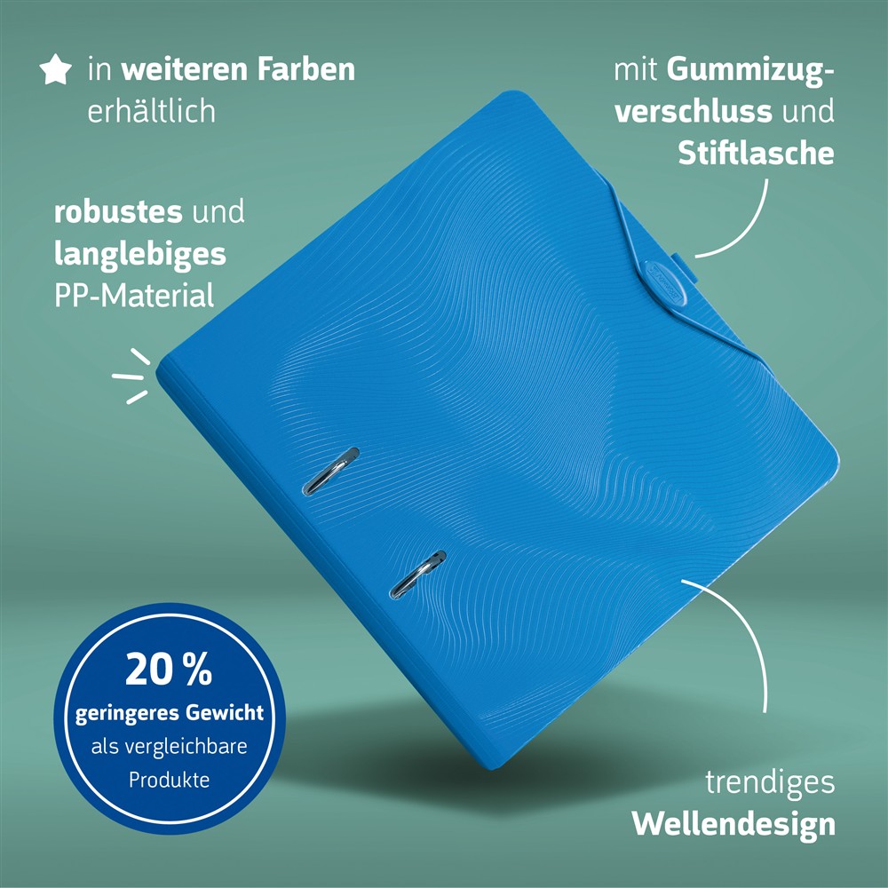 Der Ordner Wave für Unterlagen bis DIN A4 Format überzeugt mit einer robusten Verarbeitung aus langlebigem Kunststoff. Dank der stabilen Hebelmechanik mit gummiertem Griff lässt er sich besonders angenehm bedienen. Damit alles an seinem Platz bleibt, bietet der Ordner praktische Extras wie einen integrierten Stifthalter, einen Gummizugverschluss und eine Einstecktasche im Deckel. Durch den schmalen, geraden Rücken ist der Ordner besonders platzsparend und liegt zudem flach auf dem Schreibtisch.
